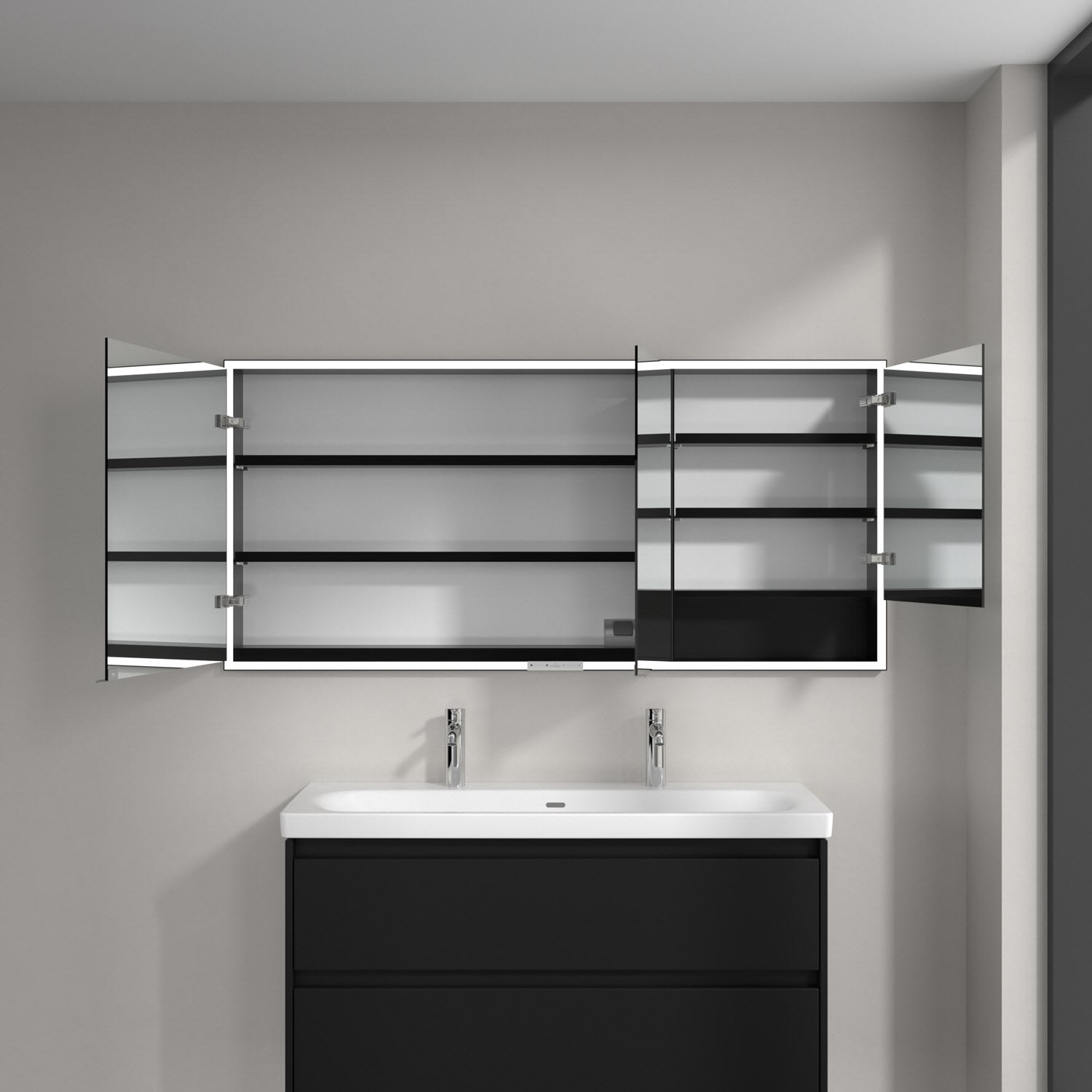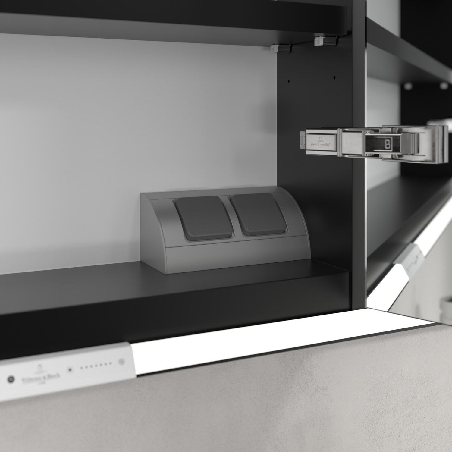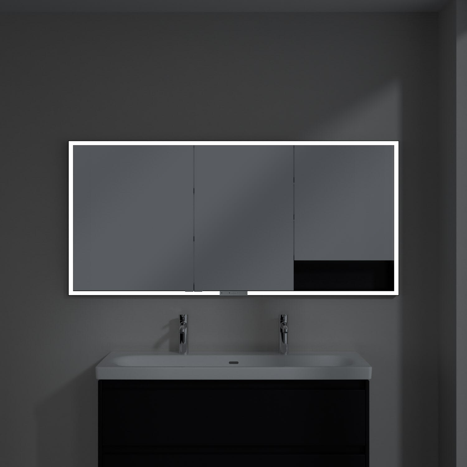 Das umlaufende LED-Lichtband bietet eine gleichmäßige Ausleuchtung, die integrierte Waschtischbeleuchtung und die beleuchteten offenen Fächer schaffen ein stimmungsvolles Ambiente. Helligkeit und Farbtemperatur lassen sich bequem per Sensor oder Smart-Home-Steuerung einstellen. Filigrane Griffe ermöglichen ein bequemes Öffnen der Türen ohne Fingerabdrücke, eine innenliegende Doppelsteckdose bietet zusätzliche Funktionalität.