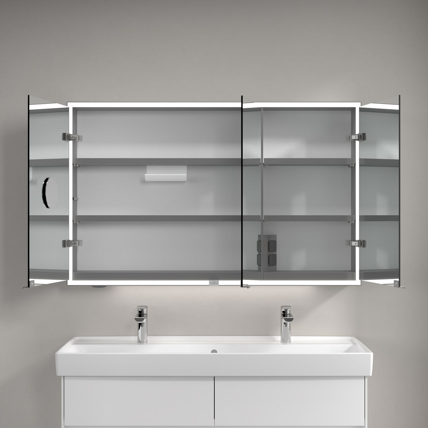 Der Aufputz-Spiegelschrank My View Now von Villeroy & Boch überzeugt mit einem durchdachten Gesamtkonzept und cleveren Detail-Lösungen: Das komplett um die Spiegelfläche verlaufende Lichtband mit austauschbaren LED-Leuchten sorgt für eine optimale Ausleuchtung des Gesichts von allen Seiten. Durch das Verbinden mit einem Hub/Gateway, das den Zigbee 3.0 Home Automation-Standard nutzt (z.B. Philips Hue Bridge oder geeignete Amazon Echo Modelle), erfolgt die komplette Lichtsteuerung über die Smart Home-Umgebung. Über den Sensorschalter unten in der Mitte lässt sich die Beleuchtung an- und ausschalten. Für ein komfortables Öffnen der Tür ohne Fingerabdrücke sorgen die filigranen Griffe. Das Innere bietet großzügige Stauraummöglichkeiten und zwei integrierte Steckdosen. Die höhenverstellbaren Ablageböden aus Aluminium sind besonders reinigungsfreundlich und bieten ausreichend Stellfläche. Mit einer erhöhten Kante sorgen sie für mehr Schutz vor herausfallenden Badutensilien. Die nützliche Magnetleiste und die Ablageschale sind neben Vergrößerungsspiegel inklusive. Die praktische Außensteckdose komplettiert die durchdachten Features des My View Now!