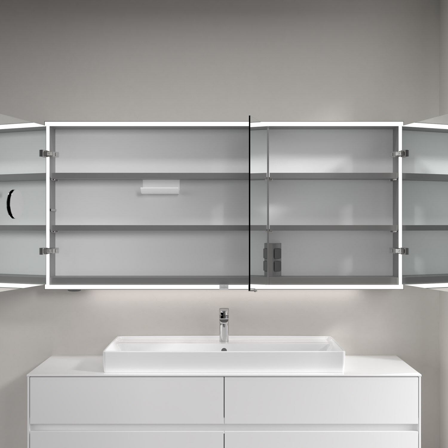 Der Aufputz-Spiegelschrank My View Now von Villeroy & Boch überzeugt mit einem durchdachten Gesamtkonzept und cleveren Detail-Lösungen: Das komplett um die Spiegelfläche verlaufende Lichtband mit austauschbaren LED-Leuchten sorgt für eine optimale Ausleuchtung des Gesichts von allen Seiten. Über einen Sensorschalter kann das Licht von außen ein- und ausgeschaltet sowie die Helligkeit und Licht-Temperatur stufenlos geregelt werden. Für ein komfortables Öffnen der Tür ohne Fingerabdrücke sorgen die filigranen Griffe. Das Innere bietet großzügige Stauraummöglichkeiten und zwei integrierte Steckdosen. Die höhenverstellbaren Ablageböden aus Aluminium sind besonders reinigungsfreundlich und bieten ausreichend Stellfläche. Mit einer erhöhten Kante sorgen sie für mehr Schutz vor herausfallenden Badutensilien. Die nützliche Magnetleiste und die Ablageschale sind neben Vergrößerungsspiegel inklusive. Die praktische Außensteckdose komplettiert die durchdachten Features des My View Now!