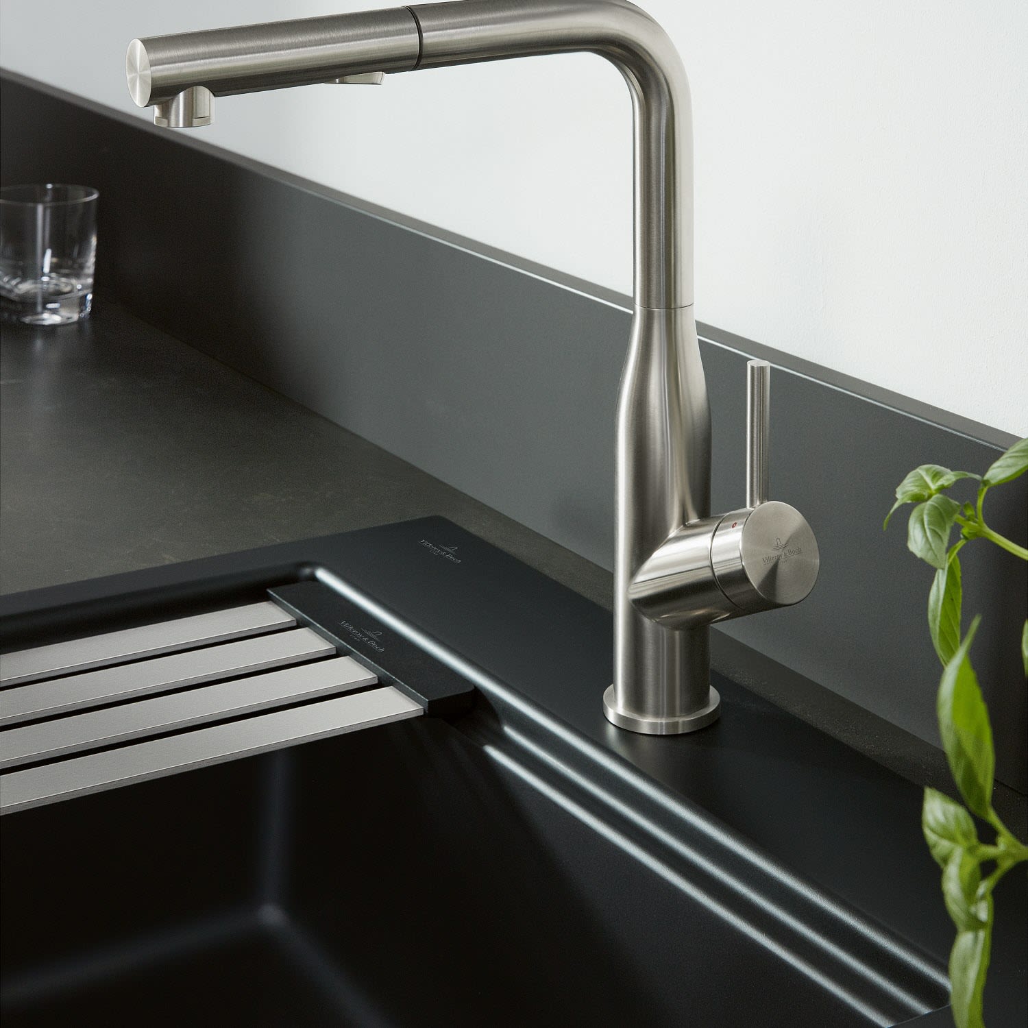 Eine Küchenspüle für maximalen Nutzungskomfort bei minimalem Platz bietet Villeroy & Boch mit der Subway Style 60 S. Sie punktet mit einem modernen, klaren Design. Die Spüle verfügt über ein großes Spülbecken für einen besonders komfortablen Abwasch. So können auch sperrige Töpfe und Pfannen ganz bequem gereinigt werden. Praktisch ist die zusätzliche Funktionsebene durch die umlaufende Stufe im Spülbecken – sie ermöglicht den Einsatz von nützlichen Accessoires wie Abtropfgitter, Schneidebrett etc. Und auch in Sachen Hygiene punktet die Spüle: Denn dank der schmutzabweisenden Oberfläche perlen Flüssigkeiten und Schmutz einfach ab. So geht die Reinigung ganz einfach von der Hand. Die hochwertige Keramikspüle zeichnet sich zudem durch eine zuverlässige Kratz-, Schlag- und Stoßbeständigkeit aus. Auch können weder haushaltsübliche Säuren noch Hitze oder Kälte dem strapazierfähigen Material etwas anhaben.