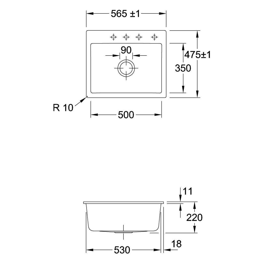 - Aussparung der Arbeitsplatte: gemäß mitgelieferter Montageschablone 57 x 48 cm