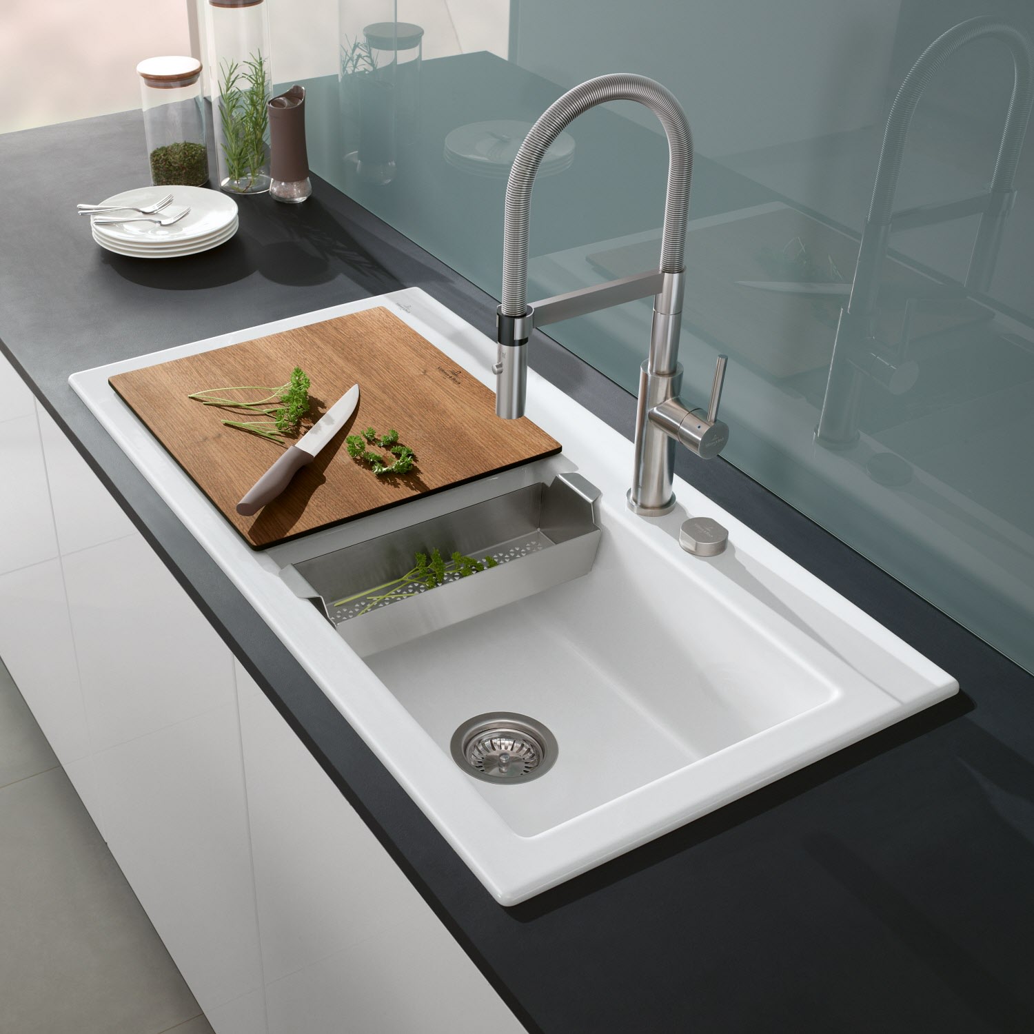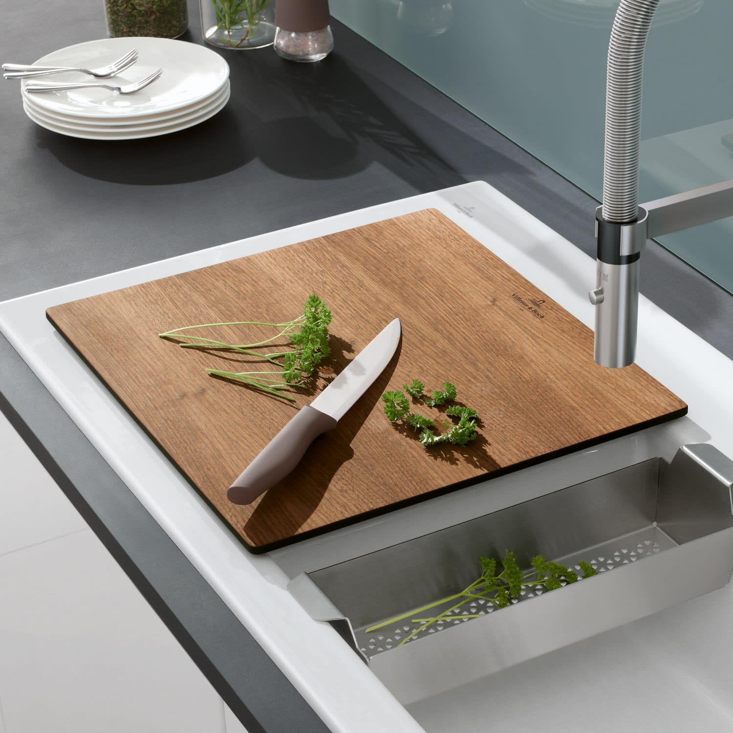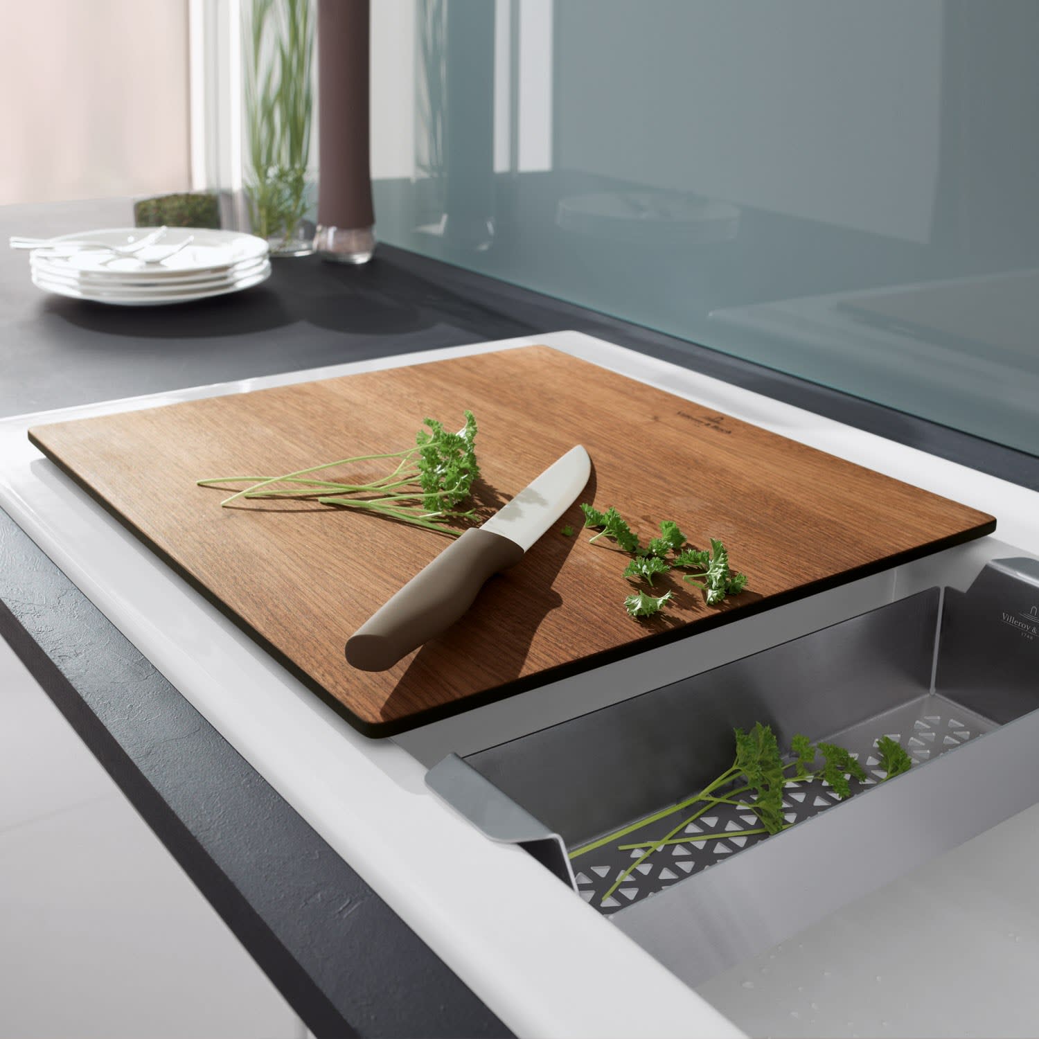 Das platzsparend konzipierte Schneidebrett von Villeroy & Boch eignet sich ideal zum komfortablen Vorbereiten von Speisen am Spülplatz. Alternativ kann es natürlich auch auf der Arbeitsfläche verwendet werden.
