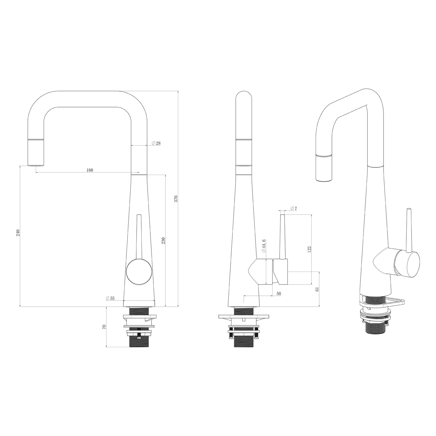 - Montage der Armatur direkt vor einer Wand möglich, da die Kalt- und Warmwasserregulierung um 90° in Richtung Küchenspüle erfolgt