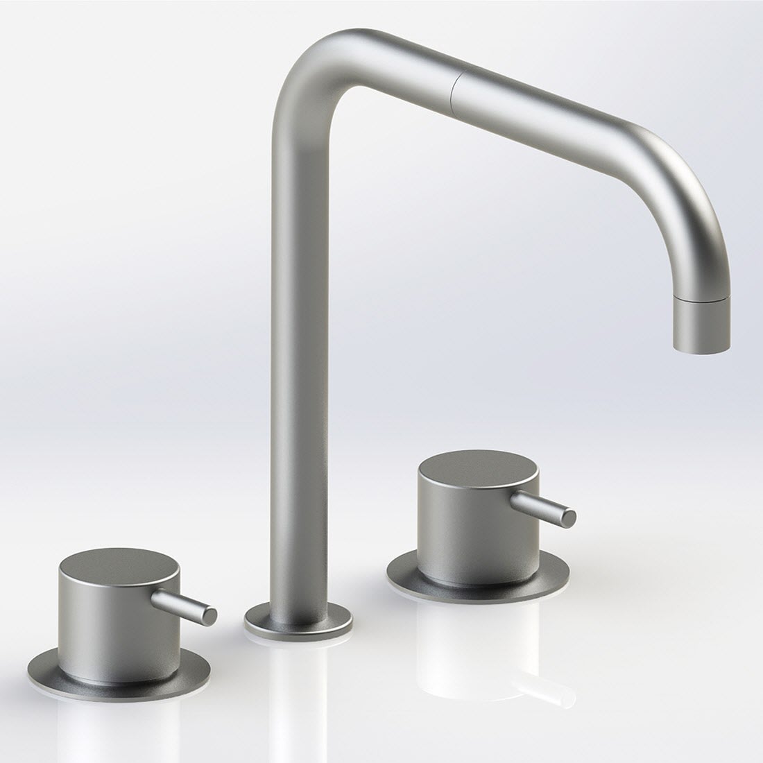 Vola Waschtisch-Dreiloch-Zweigriffmischer mit Doppelschwenkauslauf, Ausladung 20 cm