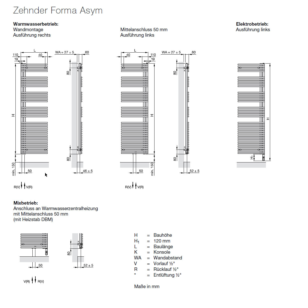 Zehnder Forma Asym LFAEL-120-50/GD Handtuchwärmer 49,6 x 128,1 cm links mit RACY-C