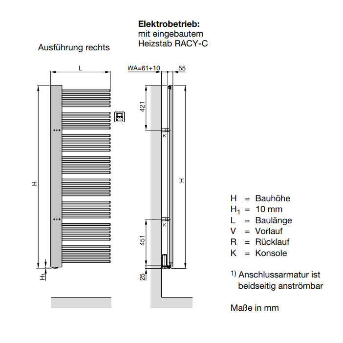 - mit Heizstab RACY-C, 750 Watt (im rechten Sammelrohr unten eingebaut)