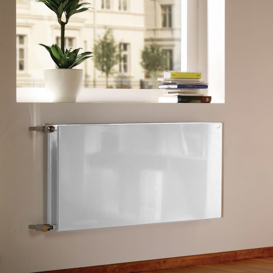 - Flachheizkörper mit glatter, plan geschliffener Vorderseite und Rückseite aus 2 mm Stahlblech